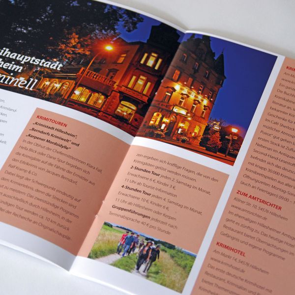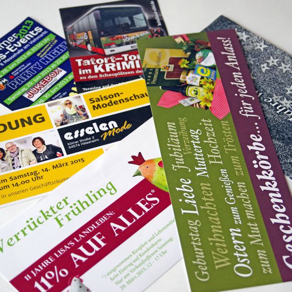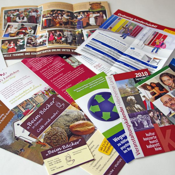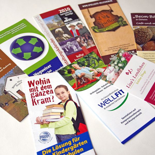 Gleich, um welche Gestaltung es geht, ob Prospekte, Broschüren, Flyer, Faltblätter, Plakate, Kataloge, Menükarten, Briefbögen, Visitenkarten oder Geschäftsdrucksachen, bei mir erhalten Sie professionelle Ergebnisse. Ich liefere druckfertige Dateien in den gängigen Druckereistandards - egal, ob Sie in Ihrer Druckerei vor Ort oder online drucken lassen möchten.